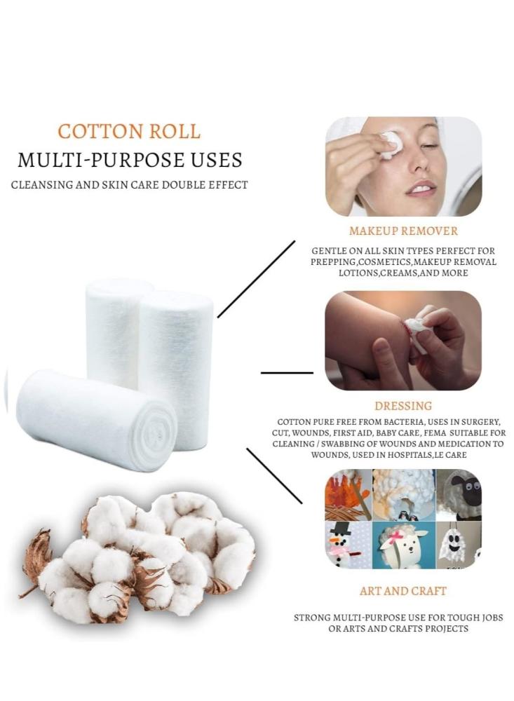 - In addition to arts and crafts, the cotton roll is ideal for most first aid uses from creating a custom sized compress to cleaning a wound or applying topical medications, to the removal of cosmetics and nail polish .